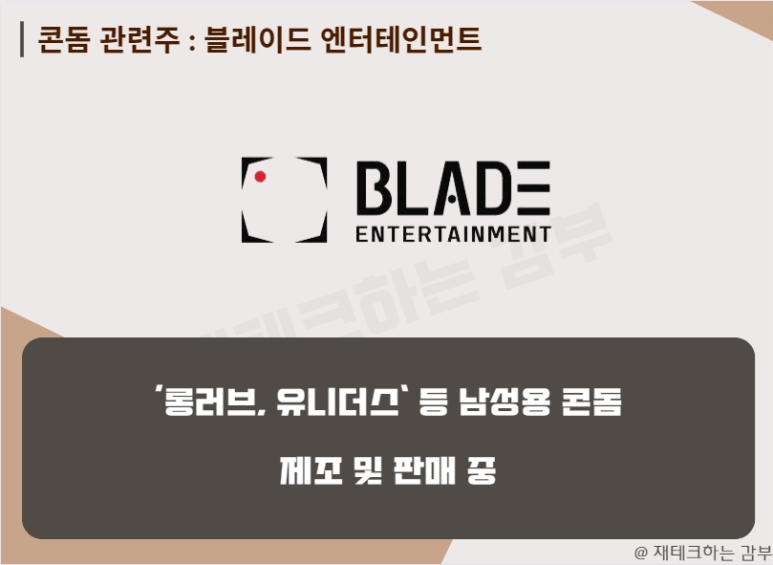 블레이드 엔터테인먼트(구. 블루베리 NFT)는 ‘롱러브, 유니더스’라는 콘돔을 제조하여 팔고 있어 관련주로 엮이게 되었습니다. 국내에서는 거의 대장주긴 합니다.